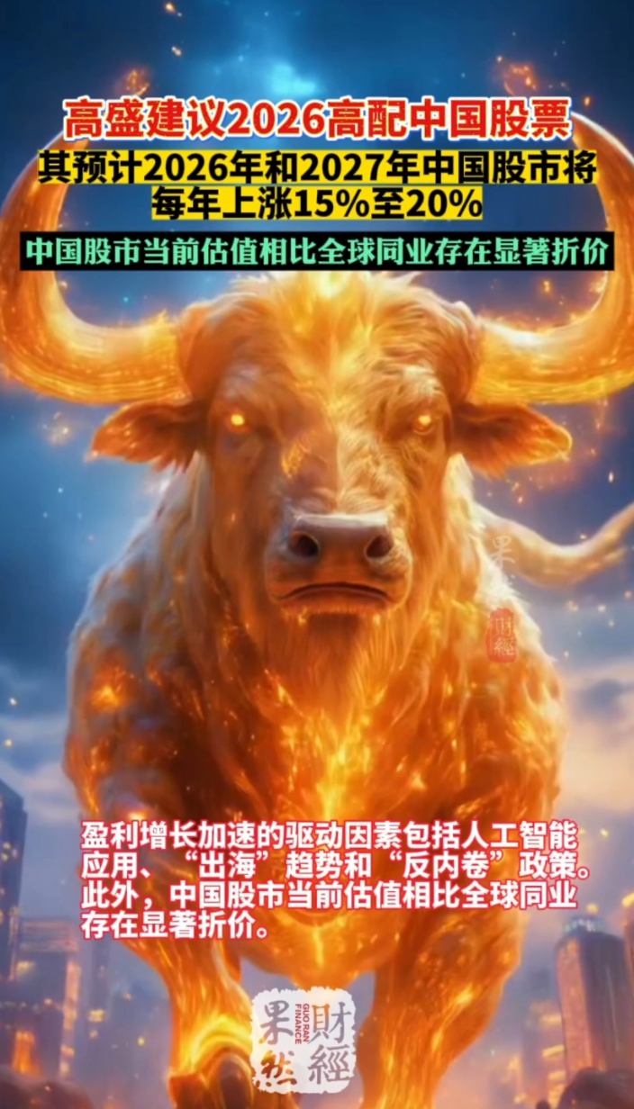 果然财经|每年涨15%-20%!高盛建议高配中国股票齐鲁晚报·齐鲁壹点客户端 01-05原创据中国证券报,高盛1月5日发布2026中国展望报告,建议高配中国股票,预计2026-2027年中国股市每年涨15%-20%,支撑因素为盈利增长与估值重估。盈利增长将受益于AI应用、出海趋势及反内卷政策,且当前中股估值较全球同业显著折价。报告同时展望中国出口存结构性上行空间,投资有望反弹,政策将加码服务消费支持。
