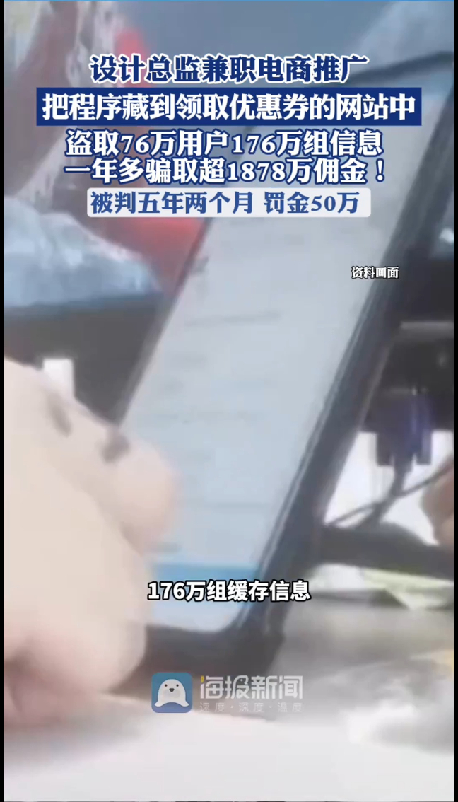 注意了!陌生的优惠券链接千万不要点!某卫浴设计总监兼职电商推广,把程序藏到领取优惠券的网站中,偷取76万用户的176万组缓存信息,用户的购物车、登录信息全被扒走 !他用偷来的购物车数据生成假推广链接,再用程序模拟点击,一年多骗了1878万佣金 !平台发现异常数据后报警,他被判五年两个月,罚金50万 。