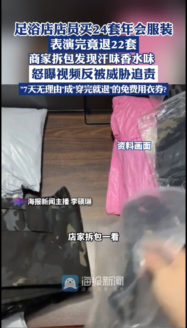 主播说 | 足浴店店员买24套年会服装,表演完竟退22套,商家拆包发现汗味香水味 ,怒曝视频反被威胁追责,“7天无理由”成“穿完就退”的免费用衣券?