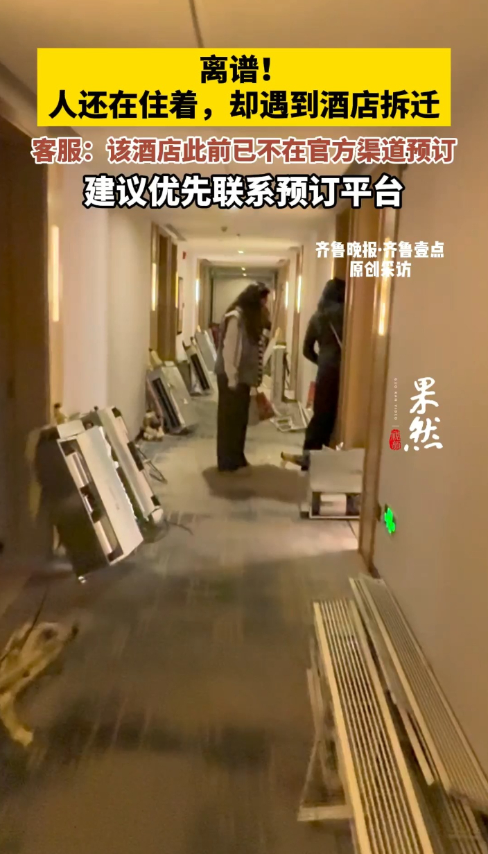 果然视频|离谱!人还在住着,却遇到酒店拆迁,客服:该酒店此前已不在官方渠道预订齐鲁晚报·齐鲁壹点客户端 01-06原创“酒店大堂的字都被拆了,门口在甩卖桌子。”1月4日,有网友发文称,在宜尚酒店广州客村地铁站琶洲会展店正常居住数日后,遇到酒店被拆的情况,网友只能收拾行李离开酒店,所幸财物没有受到损失。