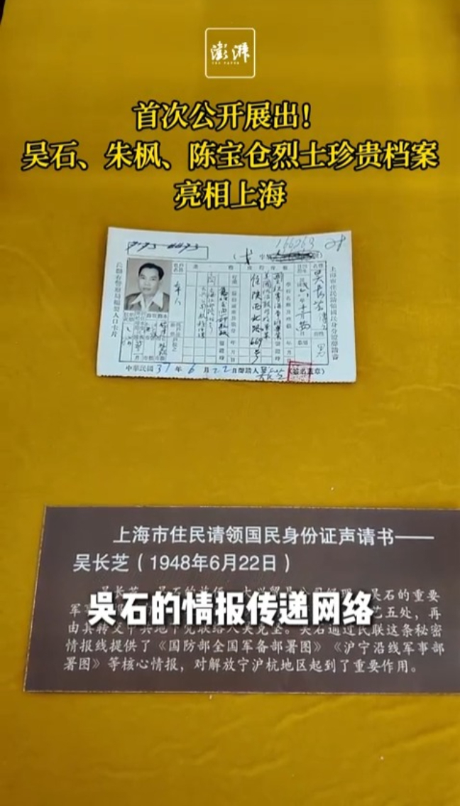 吴石、朱枫、陈宝仓烈士档案首次公开展出澎湃新闻 01-061月5日,由上海市档案局(馆)主办的“虎穴藏忠魂 曙光迎来早——上海市档案馆馆藏吴石、朱枫、陈宝仓档案陈列”在上海市档案馆公共服务大厅正式拉开帷幕。