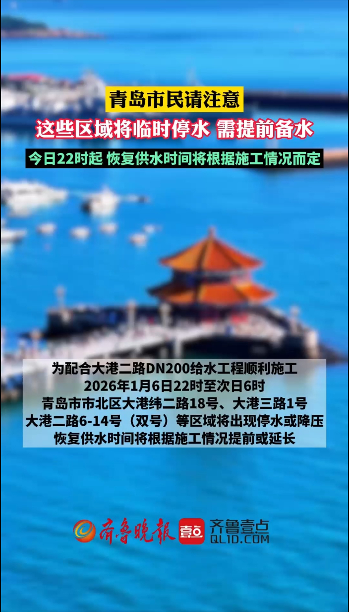 果然视频丨青岛市民请注意!这些区域将临时停水齐鲁晚报·齐鲁壹点客户端 01-06原创为配合大港二路DN200给水工程顺利施工,2026年1月6日22时至次日6时,青岛市市北区大港纬二路18号、大港三路1号、大港二路6-14号(双号)等区域将出现停水或降压,恢复供水时间将根据施工情况提前或延长。如有不明,请致电青岛水务集团96111服务热线或辖区供水服务所电话82735118。 (齐鲁晚报·齐鲁壹点 徐润杰)
