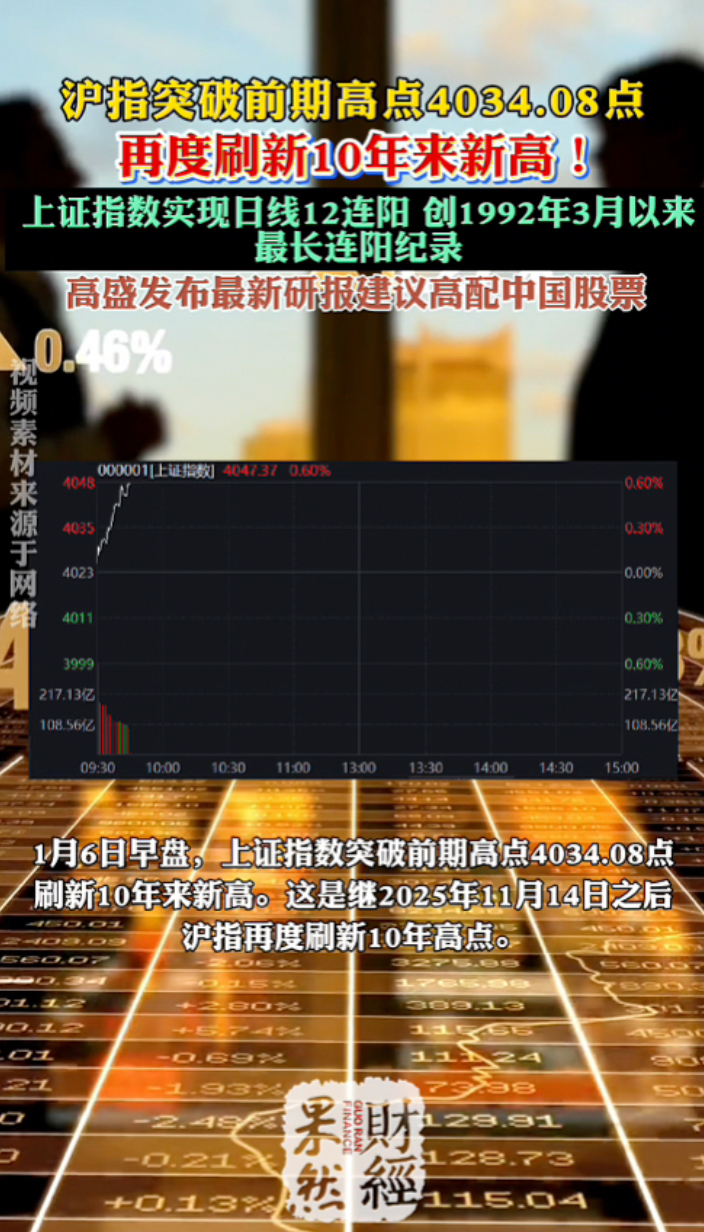 果然财经|沪指突破前期高点, 再度刷新10年来新高!齐鲁晚报·齐鲁壹点客户端 01-06原创1月6日早盘,上证指数突破前期高点4034.08点,刷新10年来新高。这是继2025年11月14日之后,沪指再度刷新10年高点。据澎湃新闻,从盘面上看,半导体设备指数盘中强势拉升,成分股呈现普涨格局。与此同时,脑机接口、固态电池板块开盘均呈现活跃状态,推动了股指大幅拉升。