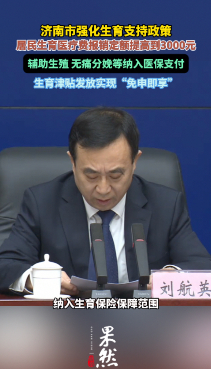 果然视频|济南市居民生育医疗费报销定额提高到3000元齐鲁晚报·齐鲁壹点客户端 01-06原创1月6日,济南市人民政府新闻办公室召开济南市高质量完成“十四五”规划主题系列新闻发布会—市医保局专场。记者在会上获悉,济南市强化生育支持政策,居民生育医疗费报销定额提高到3000元,将辅助生殖、无痛分娩等纳入医保支付,生育津贴发放实现“免申即享”。(齐鲁晚报·齐鲁壹点记者 石晟绮)