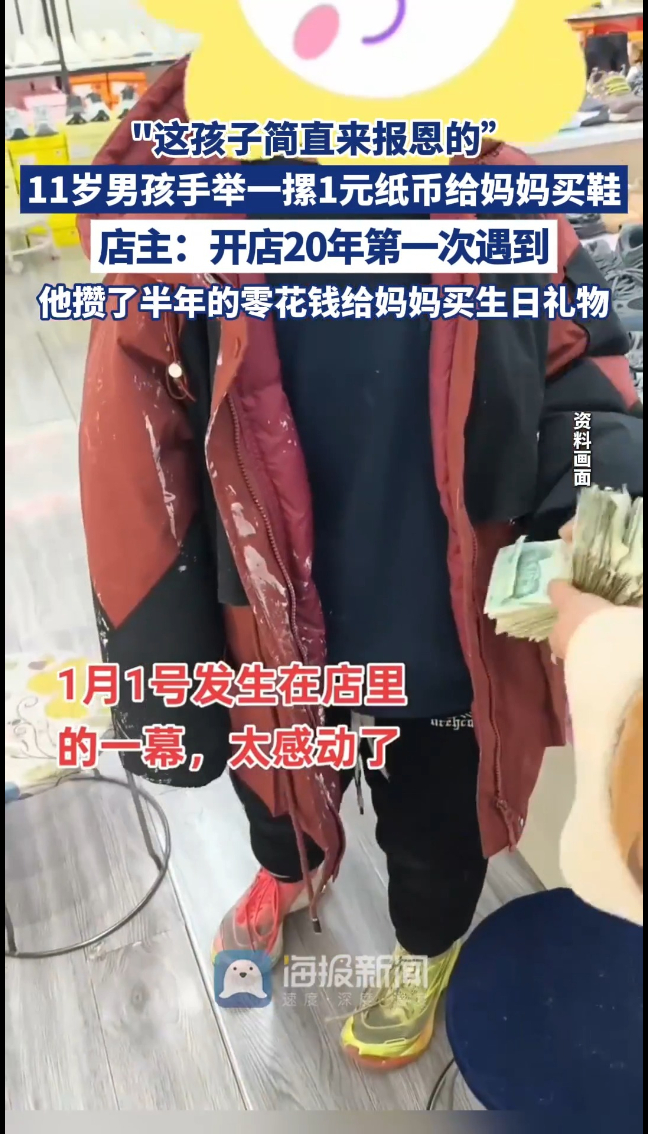 “这孩子简直来报恩的”河北石家庄一家鞋店,出现了超暖心的一幕!元旦当天,一名小男孩,手举厚厚一摞1元纸币进店买鞋,店主经过询问得知,小男孩专门攒了半年的零花钱,就是想给妈妈买一双鞋当作生日礼物。