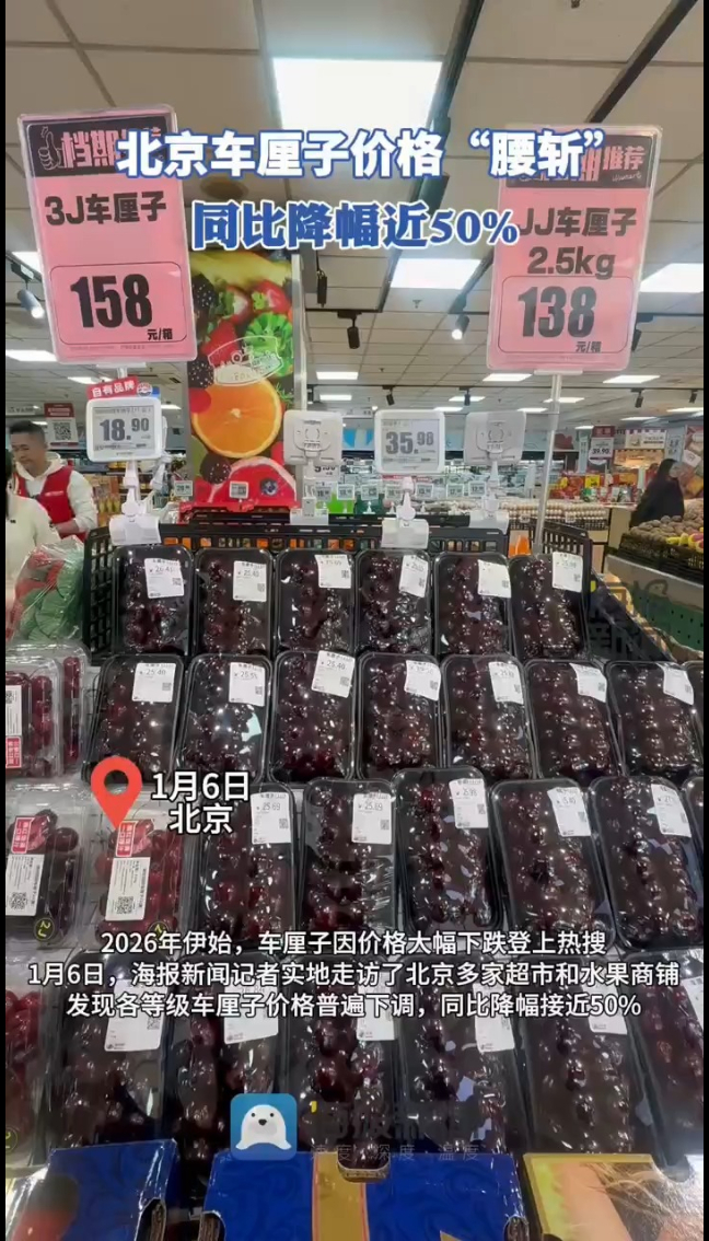2026年伊始,车厘子因价格大幅下跌登上热搜。1月6日,海报新闻(报料微信:HaibaoNewsSw)记者实地走访了北京多家超市和水果商铺发现,各等级车厘子价格普遍下调,同比降幅接近50%。