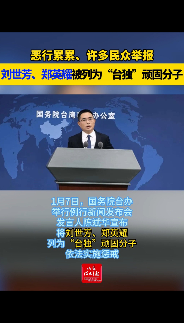 恶行累累、许多民众举报,刘世芳、郑英耀被列为“台独”顽固分子 01-07 现场央视新闻客户端 微信扫码扫码下载客户端1月7日,国务院台办举行例行新闻发布会。发言人陈斌华宣布,将刘世芳、郑英耀列为“台独”顽固分子,依法实施惩戒。两岸同胞同根同源、同文同种,要和平、要发展、要交流、要合作,是两岸同胞的共同心声。刘世芳、郑英耀倒行逆施,“台独”恶行累累,引起两岸同胞强烈愤慨。许多民众向国务院台办举报,要求对刘、郑二人进行惩处。