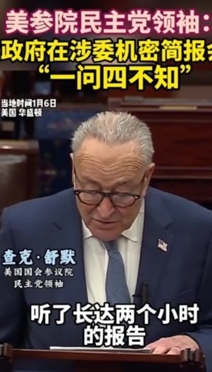 美参院民主党领袖批评:涉对委行动,特朗普政府“一问四不知”新华网 01-07美国国会参议院民主党领袖查克·舒默6日批评一场涉及委内瑞拉的机密简报会“令人不安”,称特朗普政府在对委派兵数量、要“接管”委内瑞拉多久以及成本等问题上“给不出答案”。 舒默说,在这场长达两个小时的简报会上,只听到政府“一厢情愿的想法”。“我向政府提出的四个问题,至今仍未得到任何明确答复,”他说,特朗普政府仓促启动对委行动,但没想清楚接下来怎么办。 (新华网)