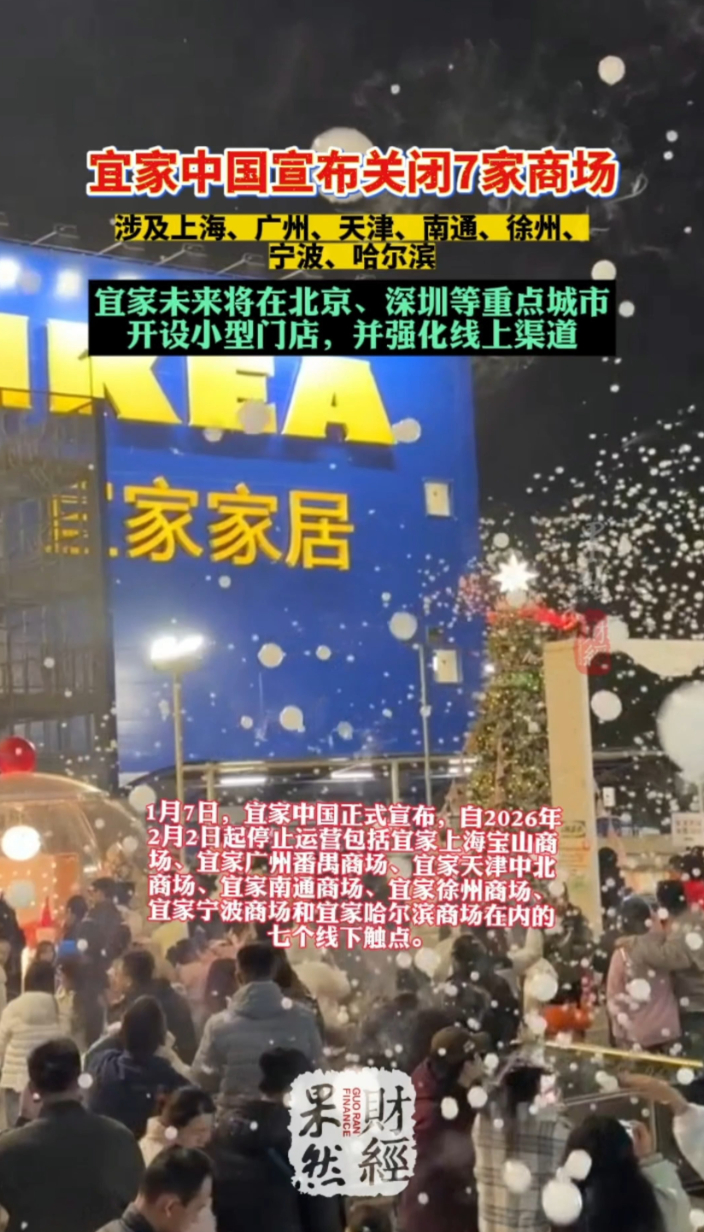 果然财经|宜家2月起关闭7家大店,看看有你的城市吗?齐鲁晚报·齐鲁壹点客户端 01-07原创从宜家获悉,宜家决定自2026年2月2日起停止运营包括宜家上海宝山商场、宜家广州番禺商场、宜家天津中北商场、宜家南通商场、宜家徐州商场、宜家宁波商场和宜家哈尔滨商场在内的七个线下触点。在接下来的两年内宜家计划开设超过十家小型门店,包括将于2026年2月开业的宜家东莞商场和将于2026年4月开业的北京通州商场。
