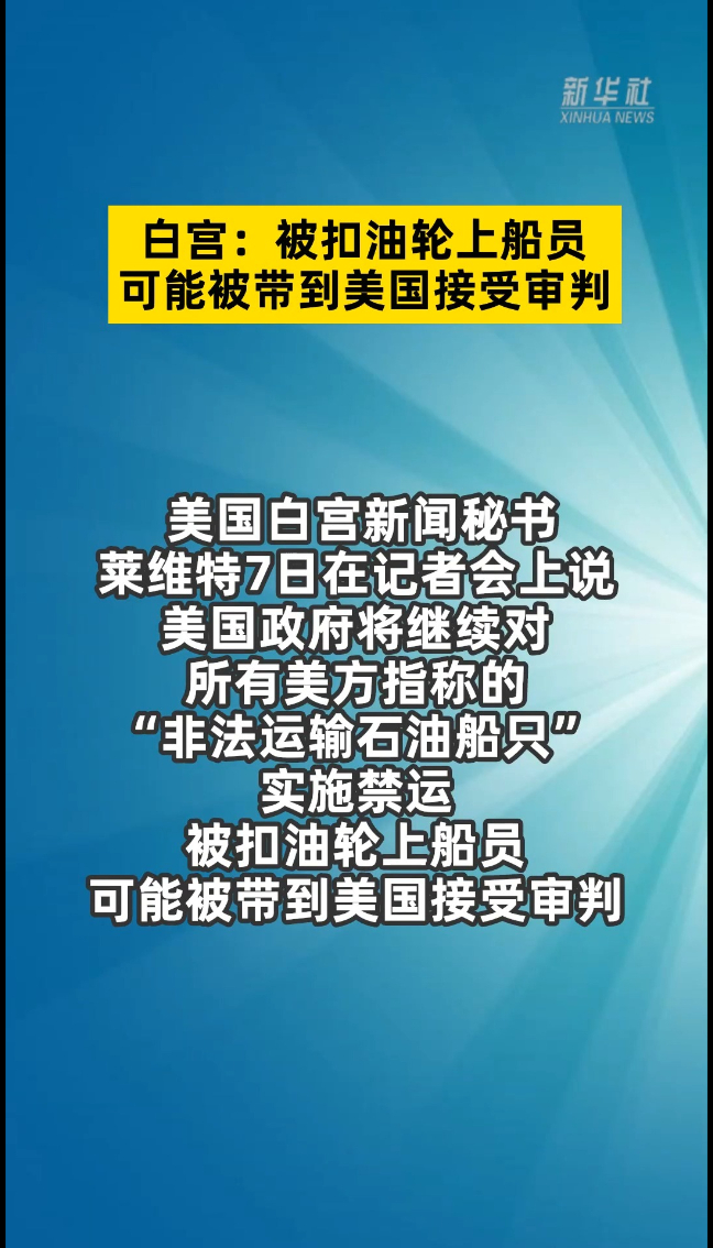 白宫:被扣油轮上船员可能被带到美国接受审判新华社音视频部制作 昨天06:43美国白宫新闻秘书莱维特7日在记者会上说,美国政府将继续对所有美方指称的“非法运输石油船只”实施禁运,被扣油轮上船员可能被带到美国接受审判。新华社音视频部制作