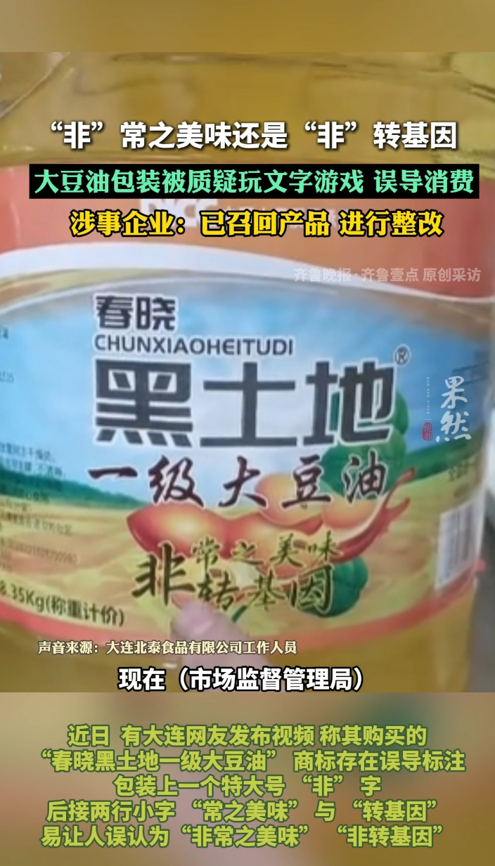 果然视频|大连一大豆油特大“非”字引争议,厂家:正召回整改齐鲁晚报·齐鲁壹点客户端 昨天11:29原创近日,有大连网友发视频,称其购买的“春晓黑土地一级大豆油“商标存在误导标注,包装上一个特大号 “非” 字,后接两行小字 “常之美味” 与 “转基因”,易让人误认为“非常之美味” 、“非转基因”。1月8日,记者联系该产品生产企业大连北泰食品有限公司,一名工作人员回应称该产品为转基因大豆油,当地市场监督管理局已介入调查 ,公司正在进行整改,并将涉事产品召回。