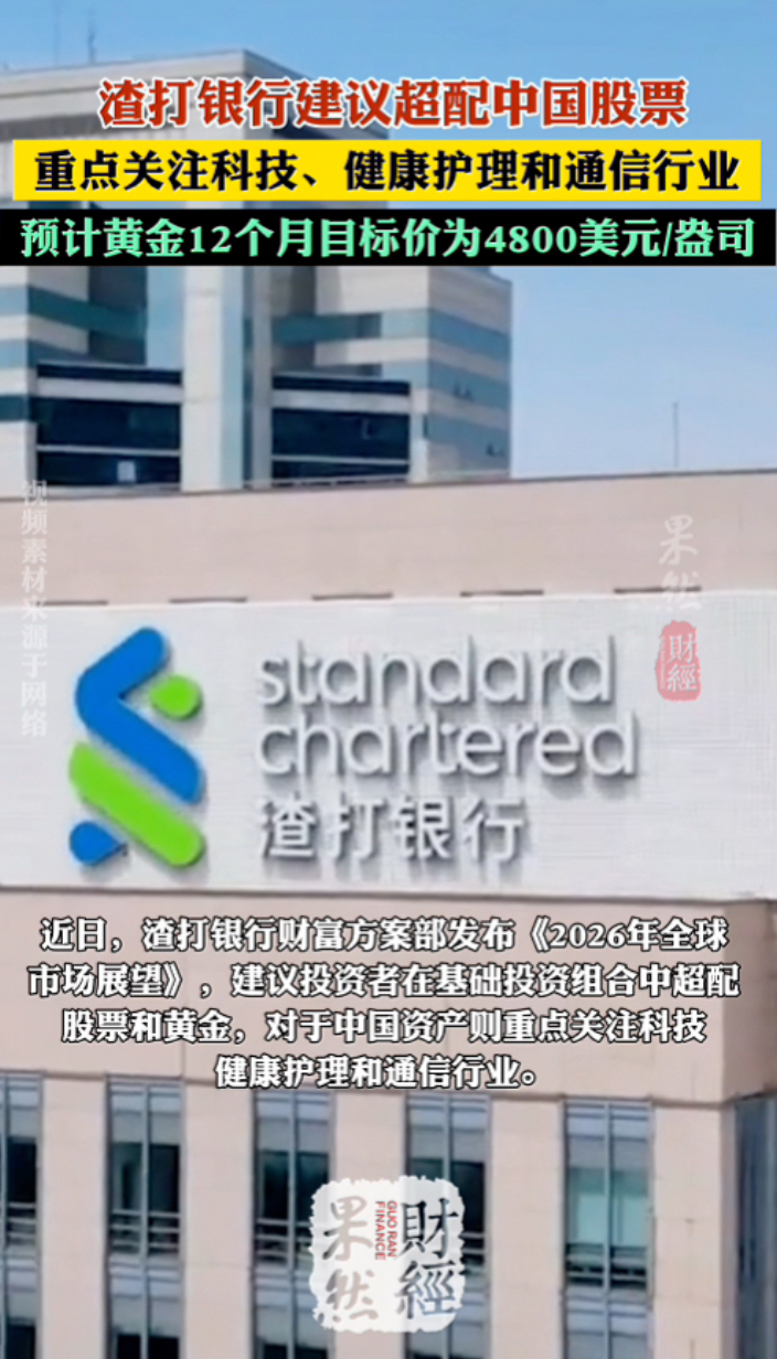 果然财经|渣打银行:超配中国股票,年末黄金目标价4800美元齐鲁晚报·齐鲁壹点客户端 昨天11:34原创近日,渣打银行财富方案部发布《2026年全球市场展望》,建议投资者在基础投资组合中超配股票和黄金,对于中国资产则重点关注科技、健康护理和通信行业。据中国经营报,在基础配置中,渣打银行建议超配美国、印度和中国股票,新兴市场债以及黄金,同时低配欧洲、英国和日本股票。