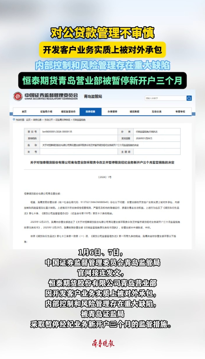 果然视频丨恒泰期货青岛营业部因存在重大缺陷被暂停新开户三个月齐鲁晚报·齐鲁壹点客户端 01-08原创1月6日、7日,中国证券监督管理委员会青岛监管局官网接连发文,恒泰期货股份有限公司青岛营业部因开发客户业务实质上被对外承包,内部控制和风险管理存在重大缺陷,被青岛证监局采取暂停经纪业务新开户三个月的监管措施。(齐鲁晚报·齐鲁壹点记者 尚青龙)
