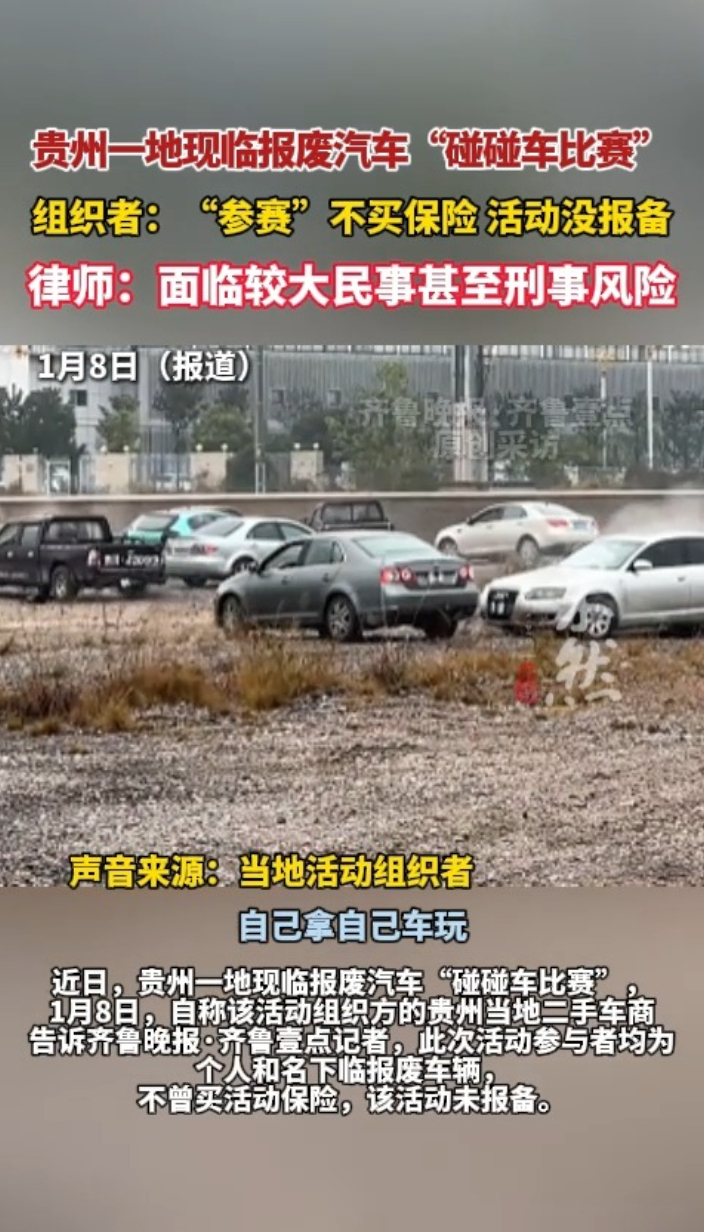 果然视频|贵州一地现临报废车“碰碰车赛”,律师:面临较大风险齐鲁晚报·齐鲁壹点客户端 01-08原创齐鲁晚报·齐鲁壹点 岳致呈 近日,贵州一地现临报废汽车“碰碰车比赛”。1月8日,自称该活动组织方的贵州当地二手车商告诉齐鲁晚报·齐鲁壹点记者,此次活动参与者均为个人和名下临报废车辆,该活动未报备,不曾买活动保险。山东新亮律师事务所姚建华律师认为,该活动面临较大民事甚至刑事风险。 (齐鲁晚报·齐鲁壹点爆料电话:0531-85193656;邮箱:405617016@qq.com)