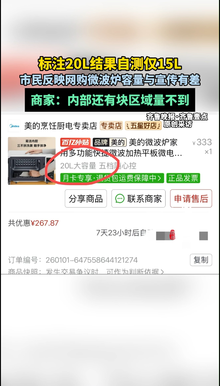 果然视频|标注20L结果自测仅15L,市民反映网购微波炉容量与宣传有差齐鲁晚报·齐鲁壹点客户端 01-08原创1月8日,山东市民董女士(化姓)向齐鲁晚报·齐鲁壹点记者反映,自己网购了一台美的20L某型号微波炉,到货后自测容积仅约15L,与宣传标注存在明显差异。对此,美的客服回应,内部还有块区域量不到。 齐鲁晚报·齐鲁壹点记者崔可腾 实习生 赵钰灿