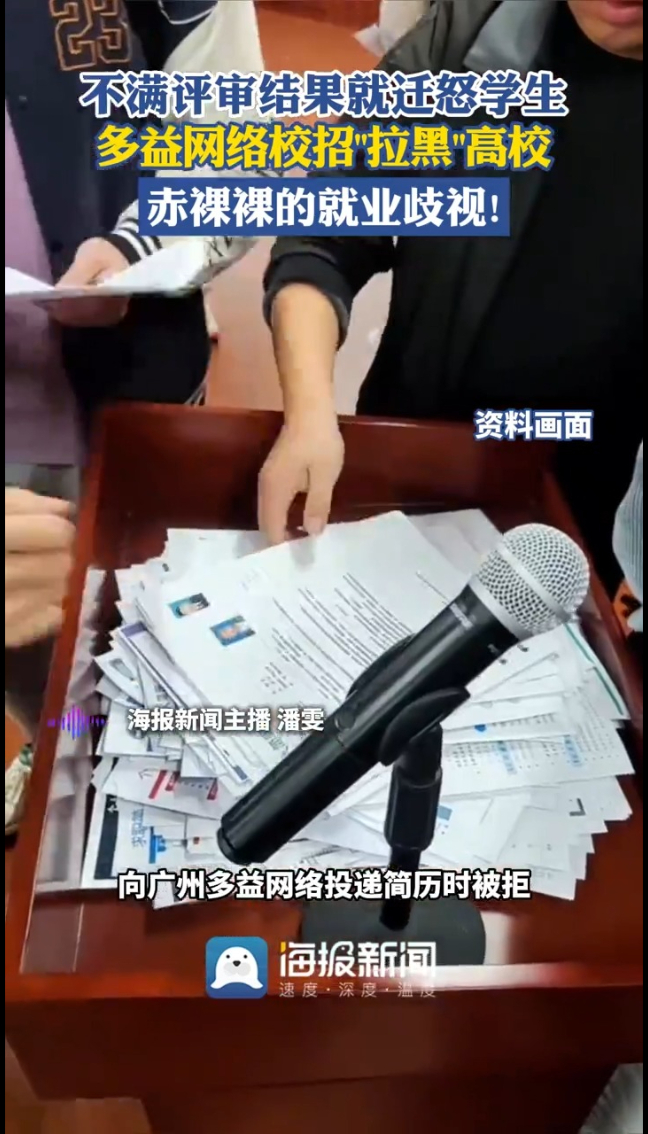 多益网络校招“拉黑”高校,这波操作简直太离谱了!1月7日,广东工业大学多名应届毕业生反映,向广州多益网络投递简历时被拒,系统提示因该校罗教授“颠倒是非”,学校已被列入黑名单。