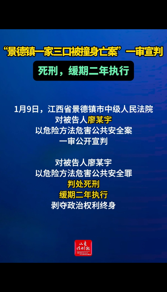 1月9日,江西省景德镇市中级人民法院对被告人廖某宇以危险方法危害公共安全案一审公开宣判,对被告人廖某宇以危险方法危害公共安全罪判处死刑,缓期二年执行,剥夺政治权利终身。