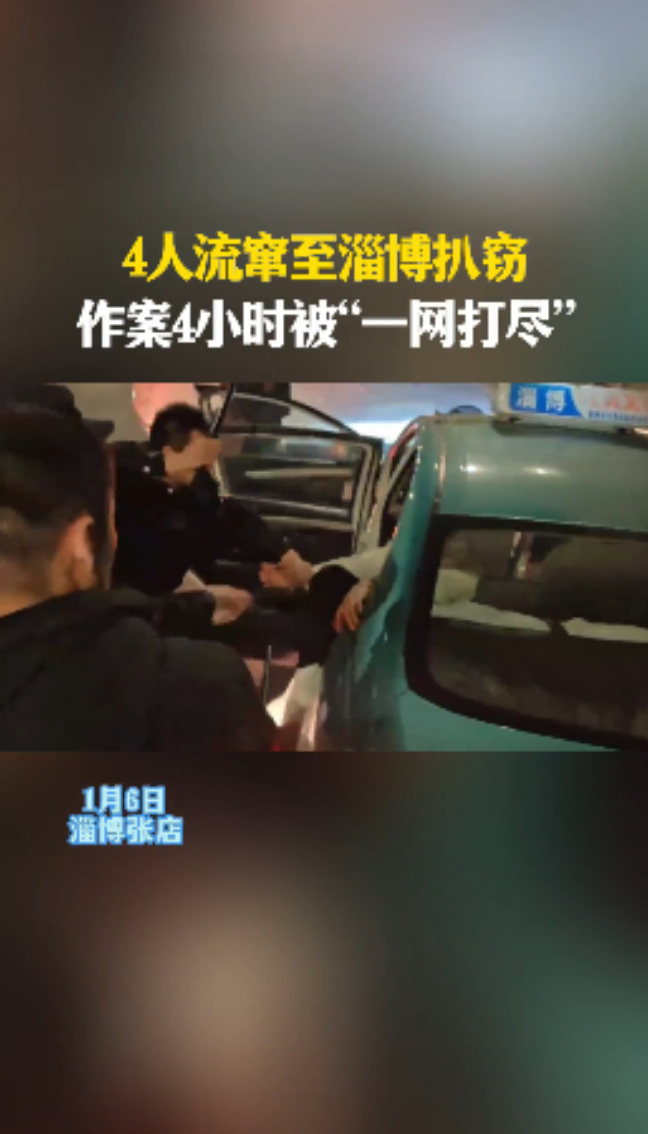 淄博市公安局张店分局立即成立专案组,全力展开侦查。专案组线上线下紧密配合,一张抓捕网悄然铺开。此时4名嫌疑人已分乘两辆出租车意图逃离淄博,在首起报案约3小时后,民警将正在等红灯的嫌疑车辆截停,抓获一名嫌疑人,其余3人也相继落网,该流窜扒窃团伙被彻底摧毁。