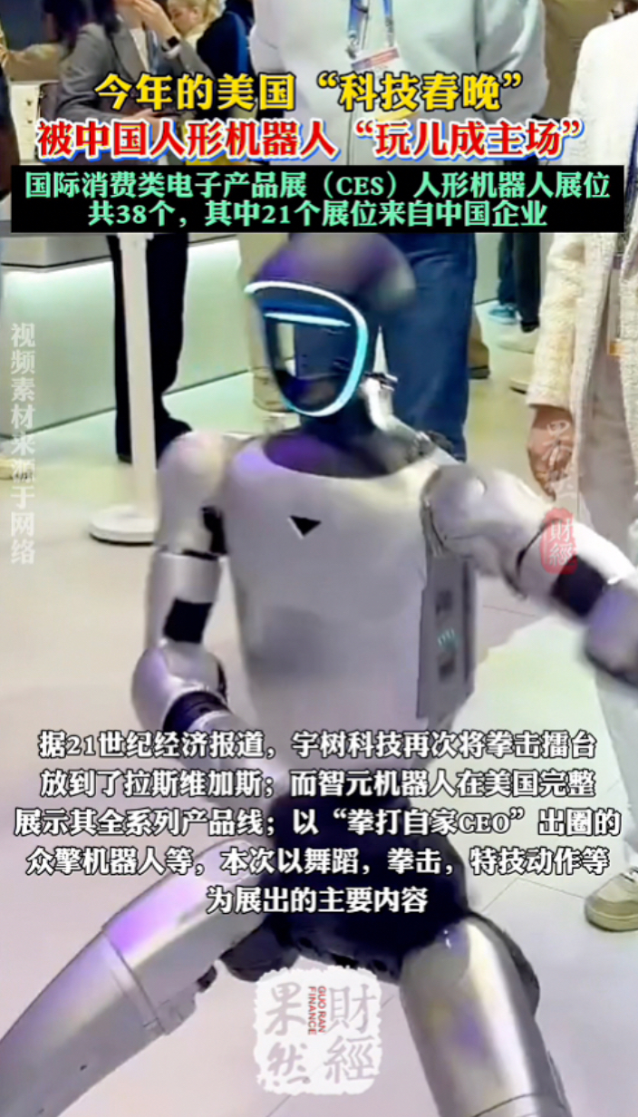 果然财经|今年美国“科技春晚”被中国人形机器人“玩成主场”齐鲁晚报·齐鲁壹点客户端 01-09原创在美国拉斯维加斯国际消费类电子产品展(CES)上,中国人形机器人企业几乎承包了今年的美国“科技春晚”。据不完全统计,CES展会共有人形机器人展位38个,其中21个展位来自中国企业,包括宇树科技、智元机器人、众擎机器人等知名机器人企业,悉数亮相。