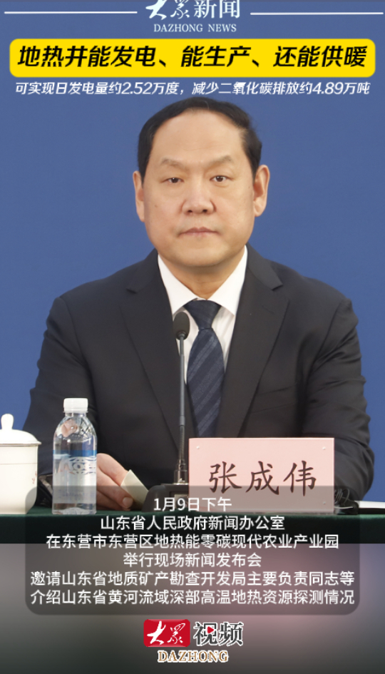 地热井能发电、能生产、还能供暖,可实现日发电量约2.52万度大众新闻 01-09原创1月9日下午,山东省人民政府新闻办公室在东营市东营区地热能零碳现代农业产业园举行现场新闻发布会,邀请山东省地质矿产勘查开发局主要负责同志等介绍山东省黄河流域深部高温地热资源探测情况。(大众新闻记者 高广超 荆新年 贾馨儒 张子良 姜倩 策划 马玉峰 陈巨慧)