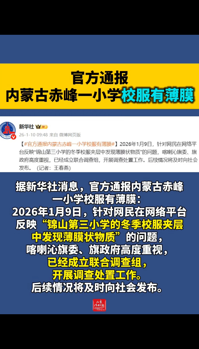 官方通报内蒙古赤峰一小学校服有薄膜 昨天19:53 新华社 微信扫码扫码下载客户端据新华社消息,官方通报内蒙古赤峰一小学校服有薄膜:2026年1月9日,针对网民在网络平台反映“锦山第三小学的冬季校服夹层中发现薄膜状物质”的问题,喀喇沁旗委、旗政府高度重视,已经成立联合调查组,开展调查处置工作。后续情况将及时向社会发布。