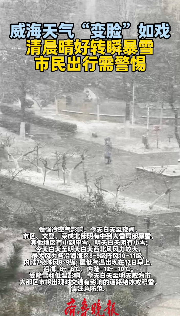 果然视频丨威海天气“变脸”如戏:清晨晴好转瞬暴雪大众报业·齐鲁壹点 昨天12:26受强冷空气影响,今天白天至夜间,威海市区、文登、荣成北部阴有中到大雪局部暴雪,其他地区有小到中雪,请注意防范。 齐鲁晚报·齐鲁壹点 王震