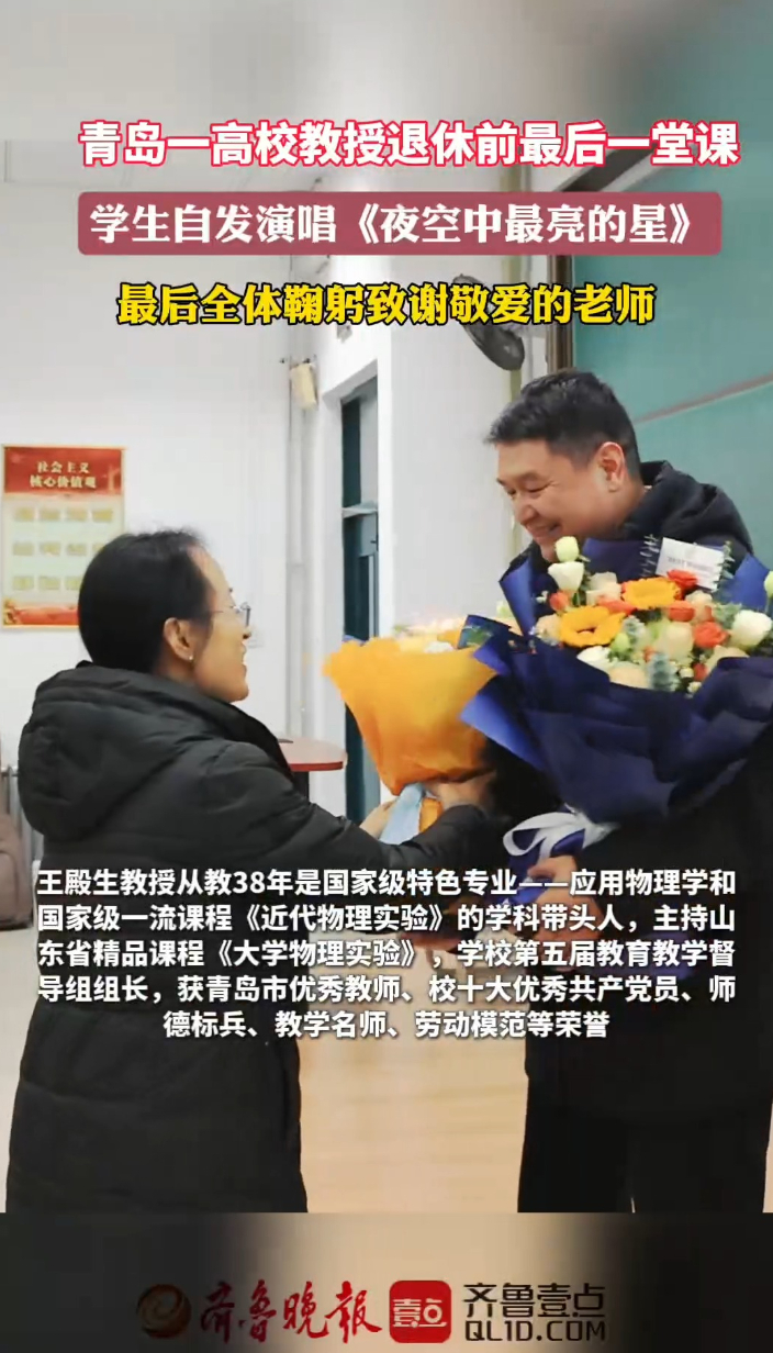 果然视频丨最后一堂课情意浓!石大学子歌声送别荣休恩师齐鲁晚报·齐鲁壹点客户端 昨天13:40原创1月6日,中国石油大学(华东)理学院王殿生教授荣休前的最后一堂课,学生在课后自发演唱《夜空中最亮的星》,祝福王殿生教授荣休。在中国石油大学(华东)的微信公众号上,王殿生教授曾经教过的学生也纷纷留言,感谢王老师的悉心教导。 (齐鲁晚报·齐鲁壹点 李珍梅 )