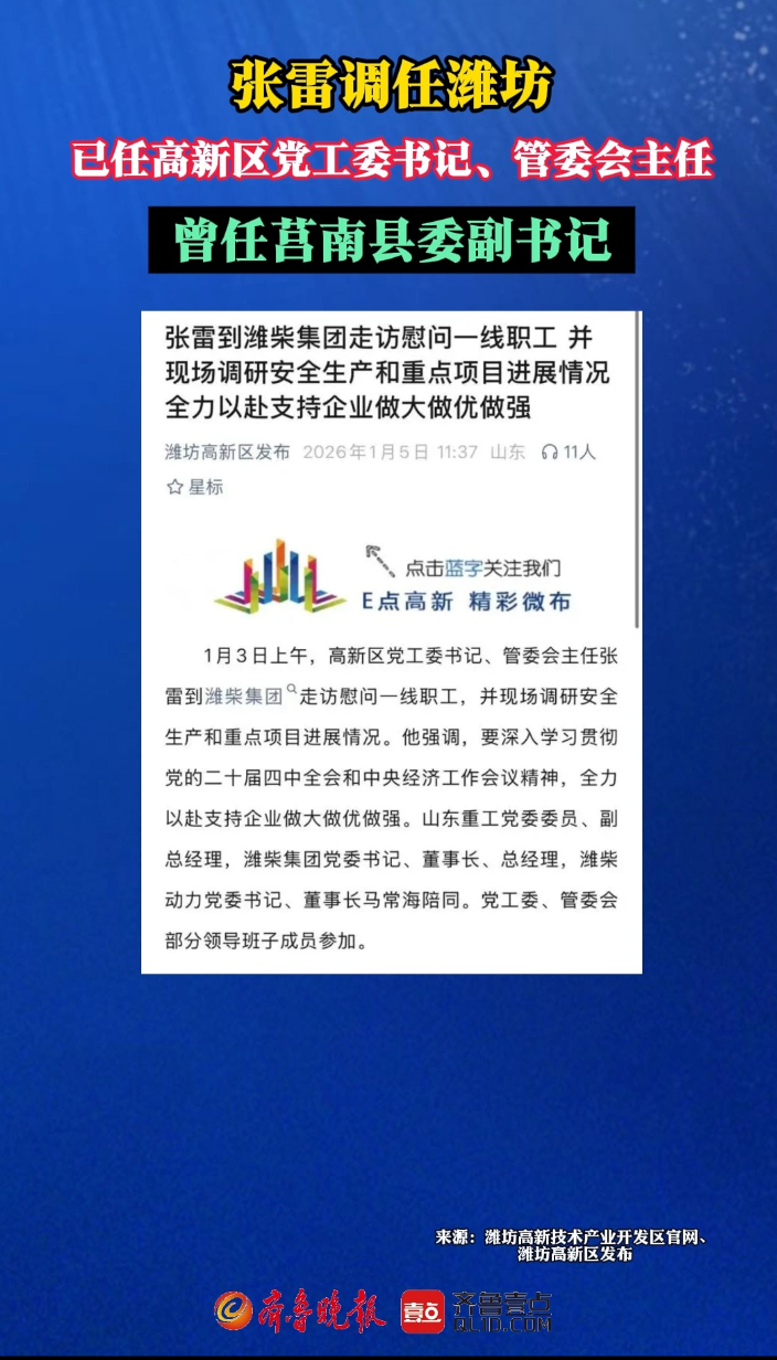 果然视频|张雷已履新潍坊,曾任临沭县委书记齐鲁晚报·齐鲁壹点客户端 昨天15:40原创据公众号“潍坊高新区发布”1月5日消息:1月3日上午,高新区党工委书记、管委会主任张雷到潍柴集团走访慰问一线职工,并现场调研安全生产和重点项目进展情况。据潍坊高新技术产业开发区官网领导介绍公开信息,张雷现任高新区党工委书记、管委会主任。主持党工委、管委会全面工作,负责审计方面的工作。张雷,男,汉族,1971年7月出生,中共党员,研究生学历。此番调整前,张雷任临沭县委书记、县委党校校长。