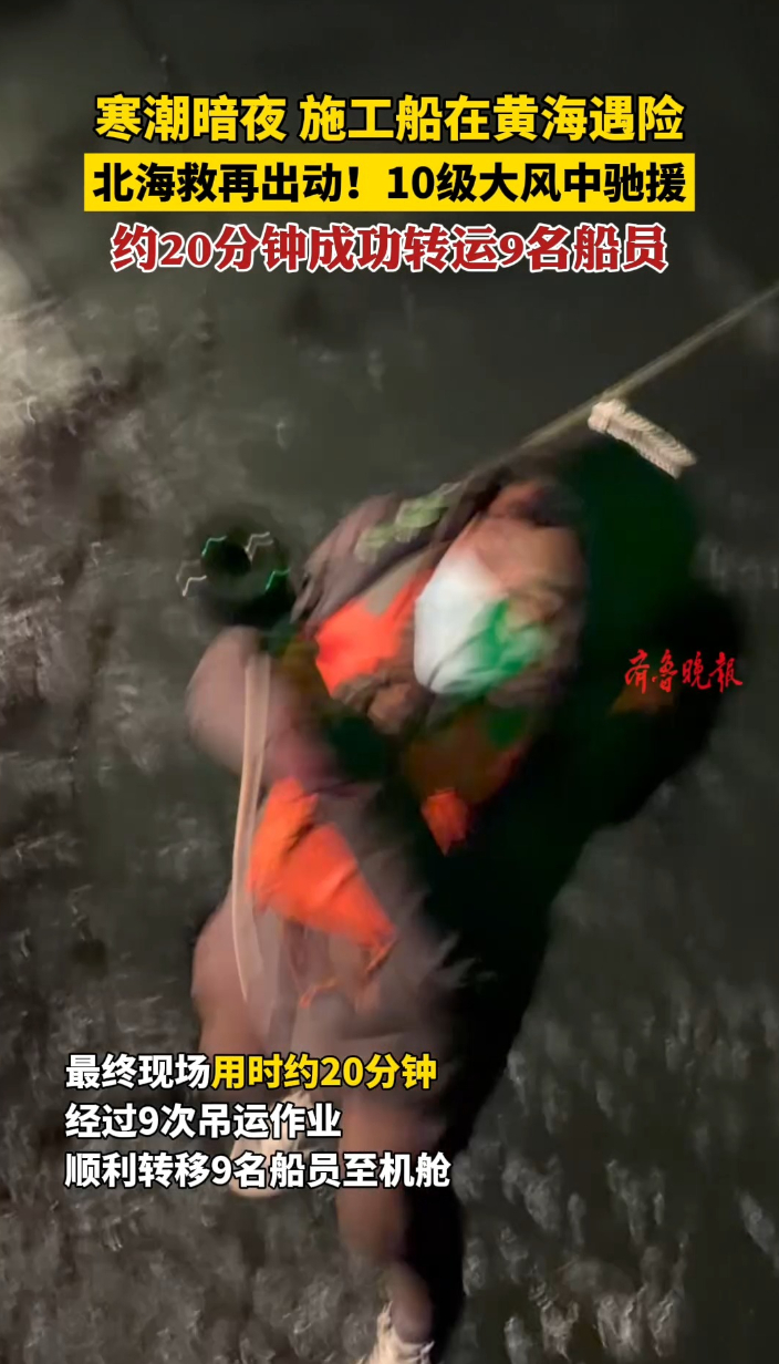 果然视频|施工船遇险!北海救直升机夜航出动,风浪中救下9人齐鲁晚报·齐鲁壹点客户端 昨天09:38原创1月10日凌晨,大风浪中施工船“海威工8810”在黄海北部水域遇险,9名船员身陷险境。交通运输部北海救助局紧急派出两架救助直升机驰援,成功将9名船员安全转移,完成北部海区首次直升机夜航救助。(齐鲁晚报·齐鲁壹点 于洋 通讯员 乔靖)