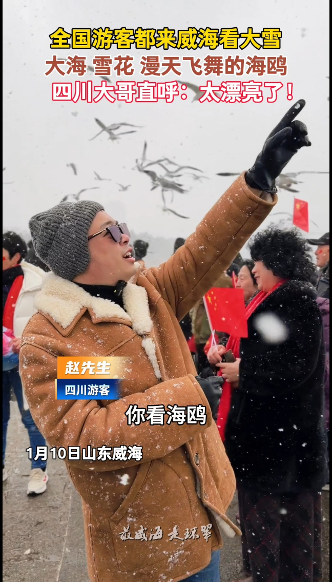 全国游客都来威海看大雪,大海、雪花,还有漫天飞舞的海鸥,四川游客直呼美极了!(大众新闻记者郑莉 通讯员 王鑫)