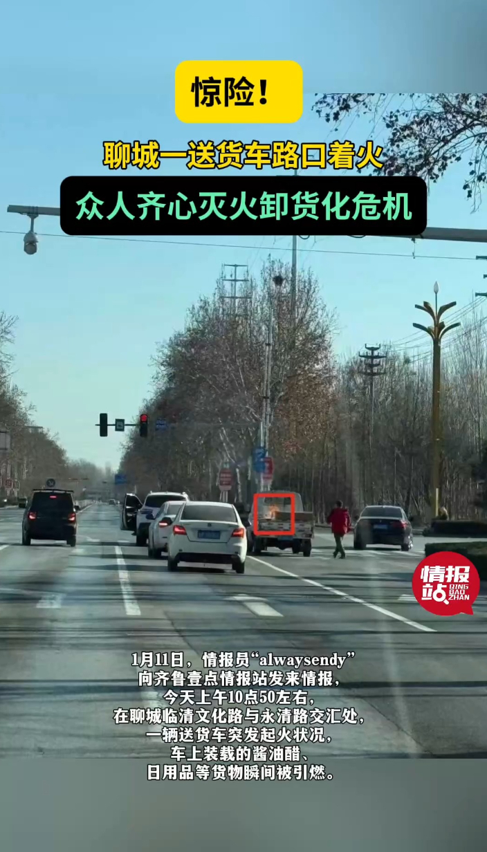 情报站|惊险!聊城一送货车路口着火,众人齐心灭火卸货化危机 昨天11:52 大众报业·齐鲁壹点 微信扫码扫码下载客户端1月11日,情报员“alwaysendy”向齐鲁壹点情报站发来情报,11日上午10点50左右,在聊城临清文化路与永清路交汇处,一辆送货车突发起火状况,车上装载的酱油醋、日用品等货物瞬间被引燃。“见此情形,众人赶忙劝货车司机将车开到路边,随后一起动手卸货,优先处理着火货物,防止货车被烧。司机迅速联系救援,所幸货物损失较小,之后热心群众默默离开了现场。”情报员说。