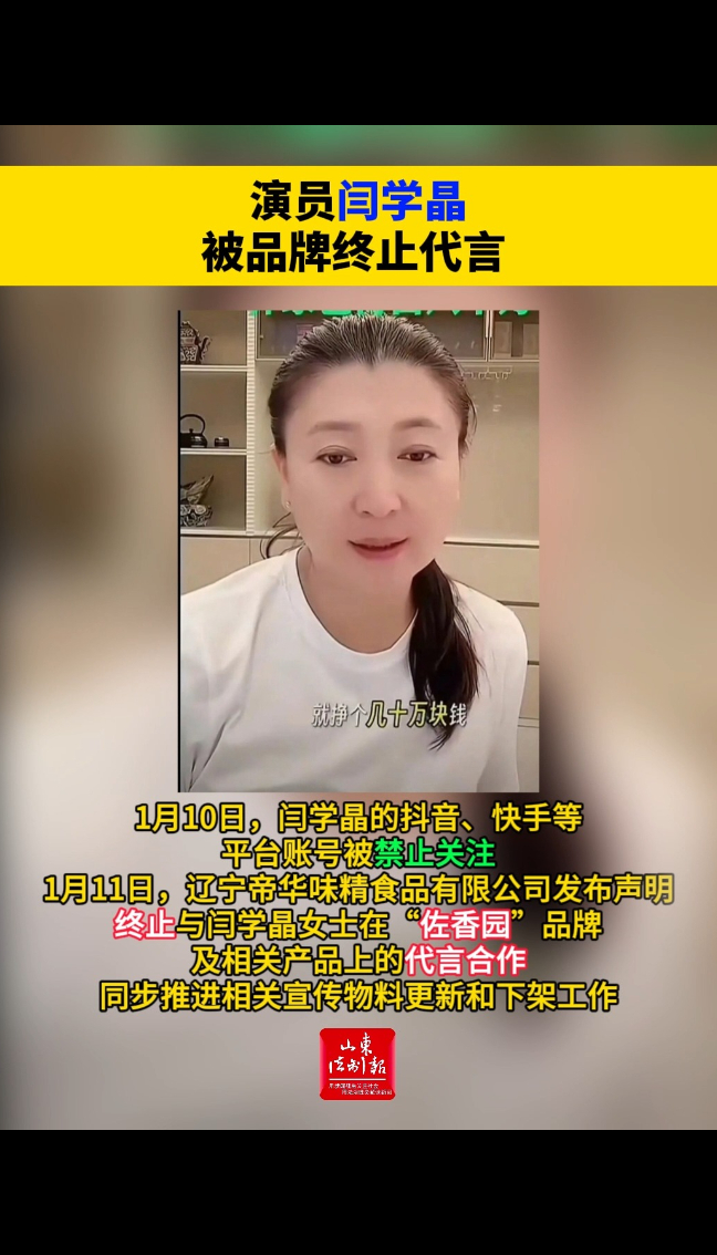 1月11日,辽宁帝华味精食品有限公司发布声明,终止与闫学晶女士在“佐香园”品牌及相关产品上的代言合作,同步推进相关宣传物料更新和下架工作。