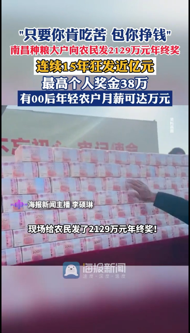 主播说 | “只要你肯吃苦 包你挣钱”南昌种粮大户向农民发2129万元年终奖,连续15年狂发近亿元,最高个人奖金38万,有00后年轻农户月薪可达万元
