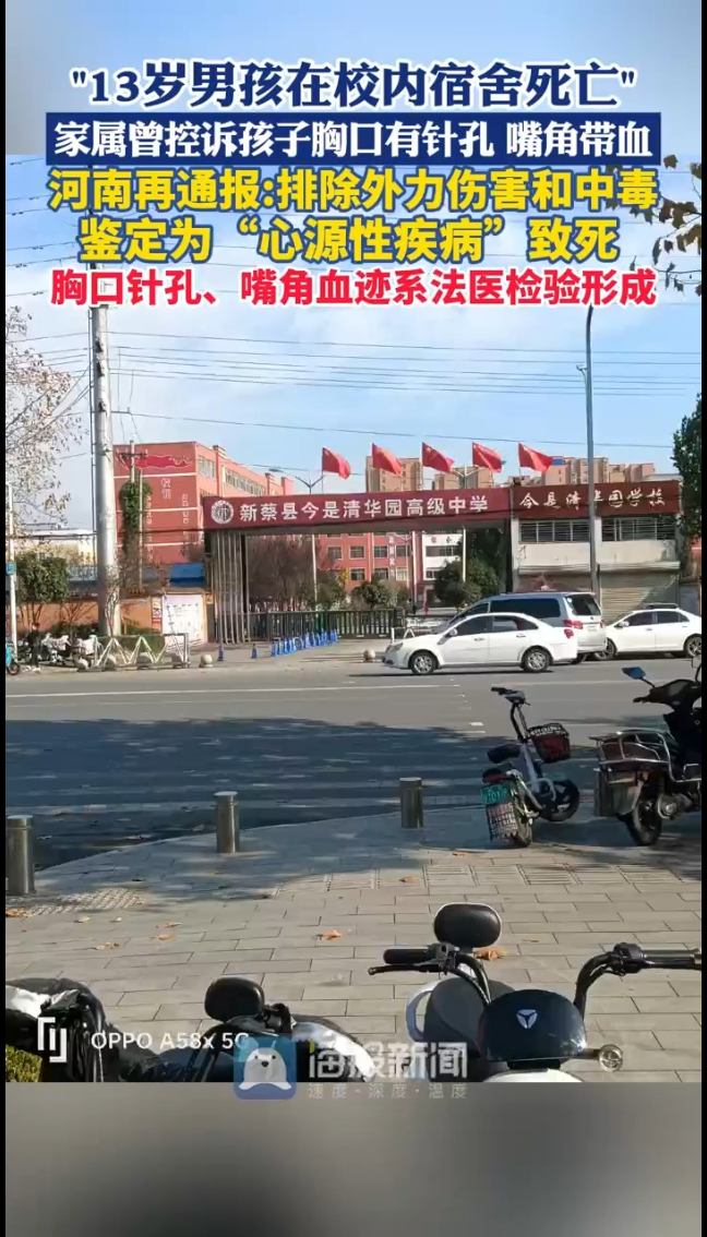 河南新蔡13岁男生校内死亡事件,联合调查组给出最终通报!1月8号清晨,今是清华园学校七年级学生朱某,在宿舍被发现死亡。此前家属质疑胸口有针孔、嘴角带血,还说学校想私自转移尸体,引发全网热议。