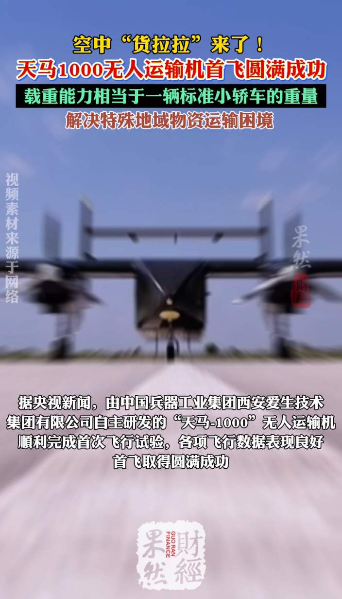 果然财经|空中“货拉拉”来了!天马1000无人运输机成功首飞齐鲁晚报·齐鲁壹点客户端 06:09原创据央视新闻,由中国兵器工业集团西安爱生技术集团有限公司自主研发的“天马-1000”无人运输机顺利完成首次飞行试验,各项飞行数据表现良好,首飞取得圆满成功。