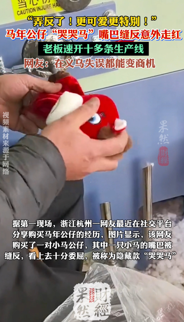 果然财经|“弄反了!”马年公仔“哭哭马”嘴巴缝反意外走红齐鲁晚报·齐鲁壹点客户端 06:13原创据第一现场,浙江杭州一网友最近在社交平台分享购买马年公仔的经历,图片显示,该网友购买了一对小马公仔,其中一只小马的嘴巴被缝反,看上去十分委屈,被称为隐藏款“哭哭马”。