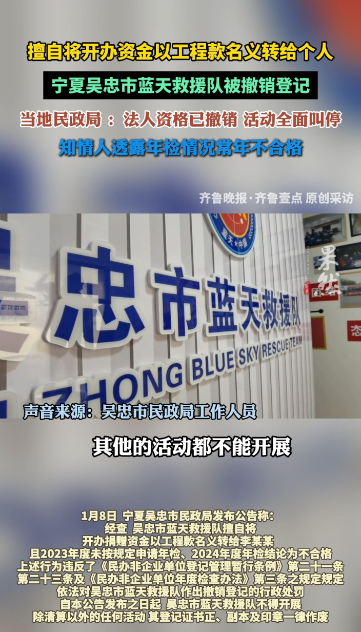 果然视频|吴忠蓝天救援队被撤销,活动全面叫停齐鲁晚报·齐鲁壹点客户端 11:35原创1月8日,宁夏吴忠市民政局发布公告,依法对吴忠市蓝天救援队作出撤销登记的行政处罚。公告显示,吴忠市蓝天救援队存在两项严重违规行为:一是擅自将开办捐赠资金以工程款名义转给李某某,涉嫌违规挪用公益资金;二是年检情况常年不合格。1月12日,记者致电吴忠市民政局,一名工作人员就处罚结果予以确认 “(救援队)的法人已经撤销了,其他的活动都不能开展。”