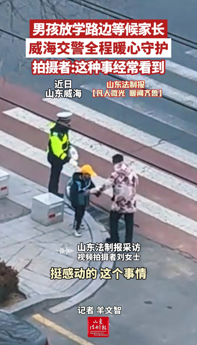 男孩放学路边等候家长,威海交警全程暖心守护,拍摄者:这种事经常看到 17:24 原创大众新闻·山东法制报 微信扫码扫码下载客户端1月4日,威海荣成一名小学生下午放学在校门口等家长,不远处的交警看到家长迟迟没来,便主动上前陪伴在男孩身边,一直等男孩家长到来。视频拍摄者刘女士说,因为家就在学校附近,这样暖心守护的画面,她见过太多次了。(大众新闻·山东法制报记者 羊文智)