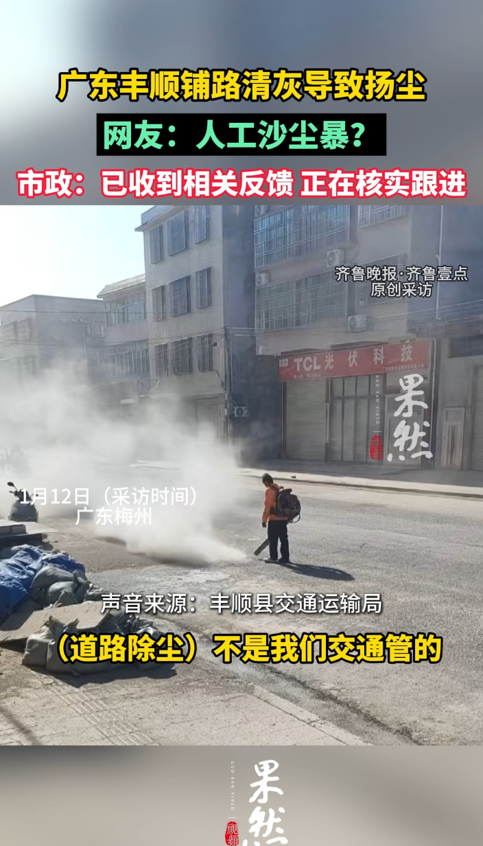 1月11日,有网友发视频显示,广东丰顺一位除尘工作人员背着鼓风机清理道路灰尘,形成巨大扬尘。有网友评论称“人工沙尘暴”。1月12日,齐鲁晚报·齐鲁壹点记者致电丰顺县交通运输局了解相关情况,工作人员表示道路清灰不归交通运输局管理,应该属于市政管理。随后记者致电丰顺县市政公用事业管理中心,工作人员表示已收到相关(反馈),正了解是哪一段道路并在核实具体是哪个单位业务,同时县政府这边也在一起跟进。