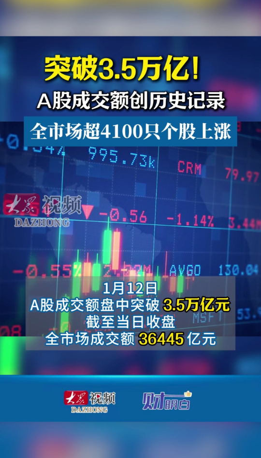 财明白|突破3.5万亿!A股成交额创历史纪录大众新闻 | 17:05 原创大众新闻 微信扫码扫码下载客户端1月12日,A股成交额盘中突破3.5万亿元。截至当日收盘,全市场成交额36445亿元,创历史纪录。(大众新闻记者 王新蕾 胡羽 龙女)