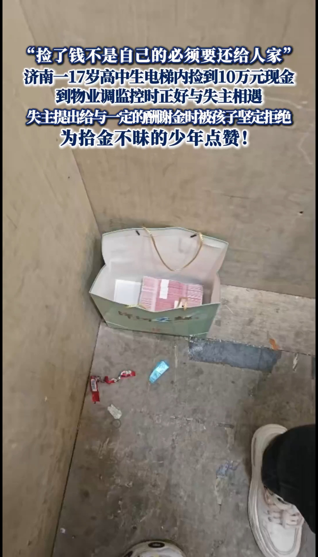 济南一17岁高中生电梯内捡到10万元现金,到物业调监控时正好与失主相遇:“捡了钱不是自己的必须要还给人家” 15:49 原创大众新闻·海报新闻 微信扫码扫码下载客户端(大众新闻·海报新闻记者 朱晓冲 报道)