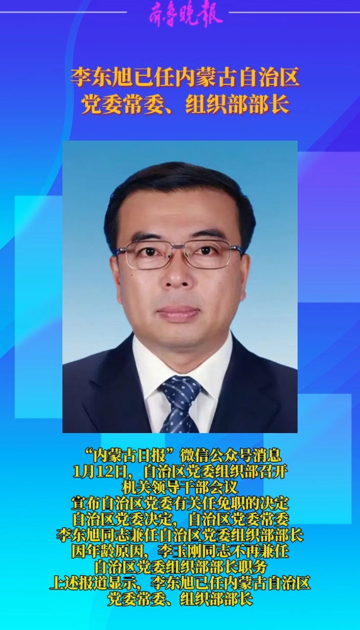 观政视频|李东旭已任内蒙古自治区党委常委、组织部部长 17:58 原创齐鲁晚报·齐鲁壹点客户端 微信扫码扫码下载客户端“内蒙古日报”微信公众号消息,1月12日,自治区党委组织部召开机关领导干部会议,宣布自治区党委有关任免职的决定。自治区党委决定,自治区党委常委李东旭同志兼任自治区党委组织部部长;因年龄原因,李玉刚同志不再兼任自治区党委组织部部长职务。