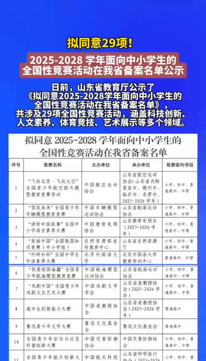 果然视频丨收藏!这29项全国性赛事拟通过官方备案齐鲁晚报·齐鲁壹点客户端 昨天19:28原创日前,山东省教育厅公示了《拟同意2025-2028学年面向中小学生的全国性竞赛活动在我省备案名单》,共涉及29项全国性竞赛活动。 (齐鲁晚报·齐鲁壹点 李珍梅)