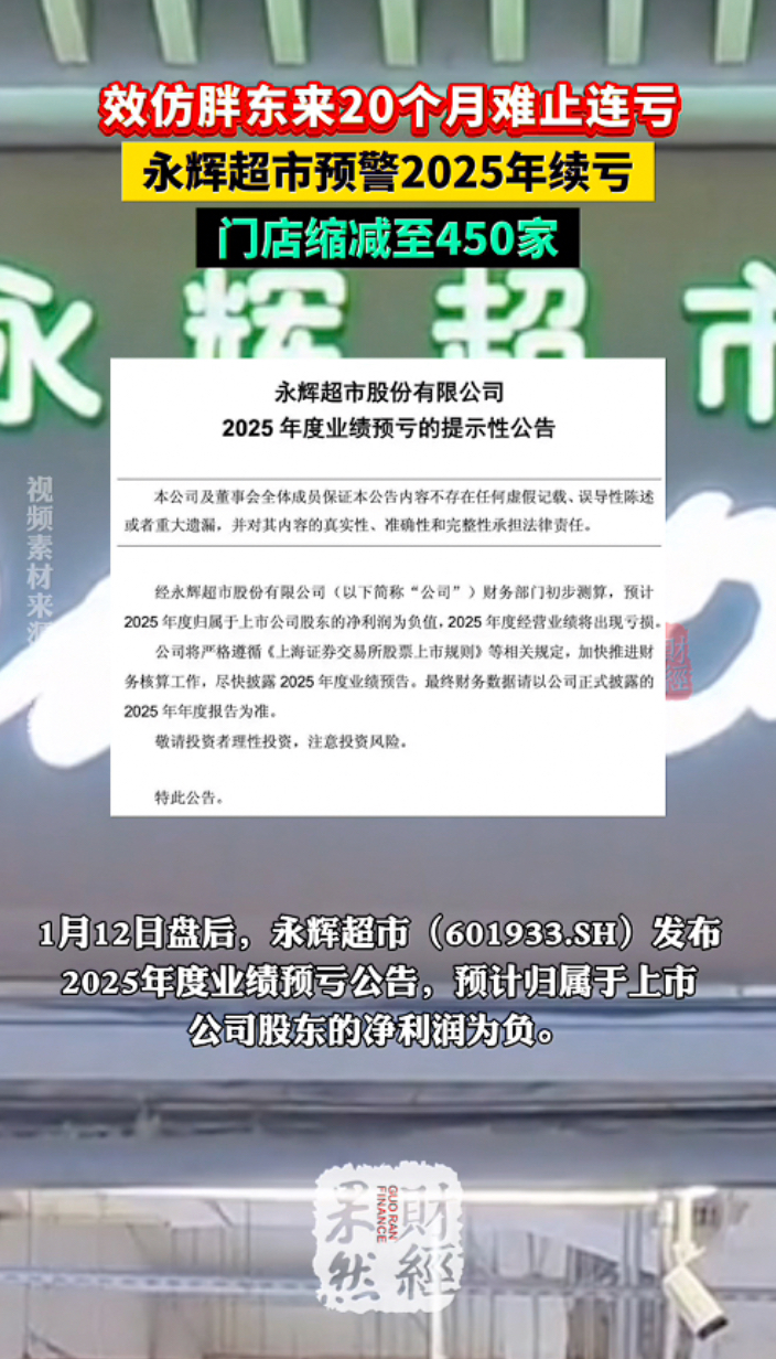 果然财经|效仿胖东来近两年难止连亏,永辉超市预警去年继续亏损齐鲁晚报·齐鲁壹点客户端 昨天14:18原创1月12日盘后,永辉超市(601933.SH)发布2025年度业绩预亏公告,预计归属于上市公司股东的净利润为负。至此,公司将连续第五个财年出现亏损。此时距离其全面启动学习“胖东来”模式已过去约20个月。