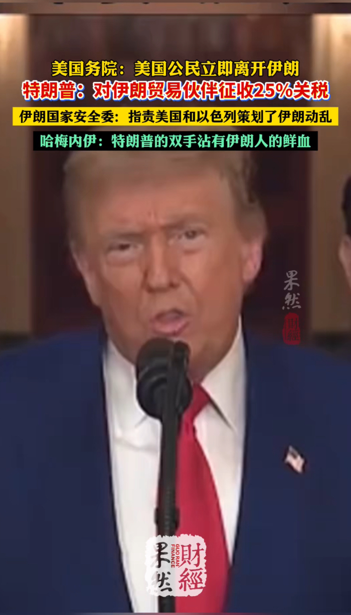 果然财经 | 特朗普:对伊朗贸易伙伴征收25%关税齐鲁晚报·齐鲁壹点客户端 昨天16:42原创据新华社,美国媒体12日报道,美国国务院要求美国公民立即离开伊朗。美国总统特朗普12日下午在社交媒体发文称,任何与伊朗有商业往来的国家在与美国进行任何商业往来时将被加征25%的关税。