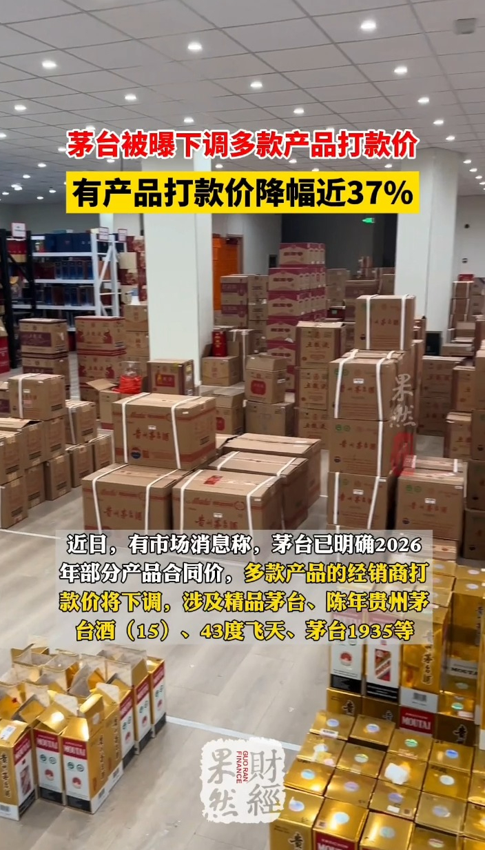 果然财经|茅台被曝下调多款产品打款价,有产品降幅近37%齐鲁晚报·齐鲁壹点客户端 昨天16:44原创近日,有市场消息称,茅台已明确2026年部分产品合同价,多款产品的经销商打款价将下调,涉及精品茅台、陈年贵州茅台酒(15)、43度飞天、茅台1935等。据悉,陈年贵州茅台酒(15)打款价拟从5399元/瓶下调至3409元/瓶,下调1990元,降幅近37%;精品茅台拟从2969元/瓶下调至1859元/瓶,下调1110元,降幅超37%。