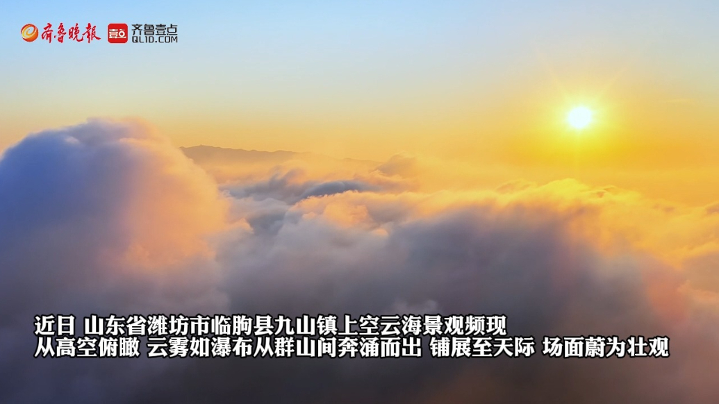 近日,山东省潍坊市临朐县九山镇上空云海景观频现。从高空俯瞰,云雾如瀑布从群山间奔涌而出,铺展至天际,场面蔚为壮观。云雾如潮似海,变幻莫测,时而升腾飘飞,时而流动飘逸,时而静谧安和,时而灵动跳跃,云海翻涌间,山川、河流、村庄若隐若现。当旭日初升,金光穿透云海洒向群山,风起云涌,山色变换,景象万千,勾勒出一幅又一幅诗意山水画卷,成为冬日里独有的视觉盛宴,尽显当地生态之美。