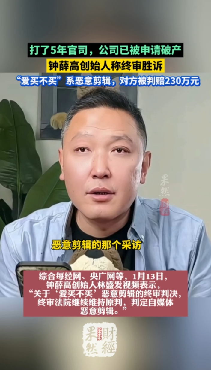 果然财经|钟薛高终审胜诉!230万赔偿难挽破产结局齐鲁晚报·齐鲁壹点客户端 昨天20:09原创1 月 13 日,钟薛高创始人林盛发视频宣布 “爱买不买” 恶意剪辑案终审胜诉,法院维持原判认定自媒体侵权。该案始于 2021 年,历时近 5 年,2025 年一审已判定被告赔偿 230 万元并道歉。值得注意的是,钟薛高于 2025 年 7 月因无力清偿债务被申请破产,此次胜诉虽洗清名誉污点,却难以改变企业破产的既定事实。