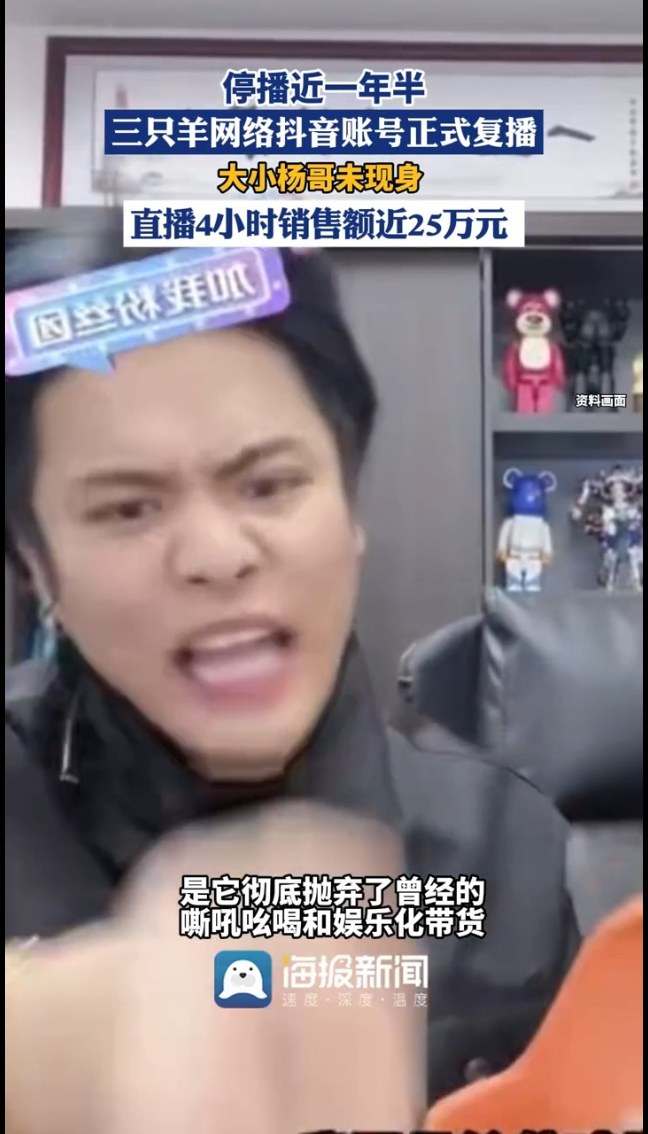 主播穿着简约,全程走成分解析、使用演示、售后承诺的标准化流程,每款产品都亮质检报告、溯源信息,而大小杨哥全程没现身。此外,除了官方账号,三只羊旗下主播嘴哥、乔妹、卓仕琳、老K等账户均于几日前复播。