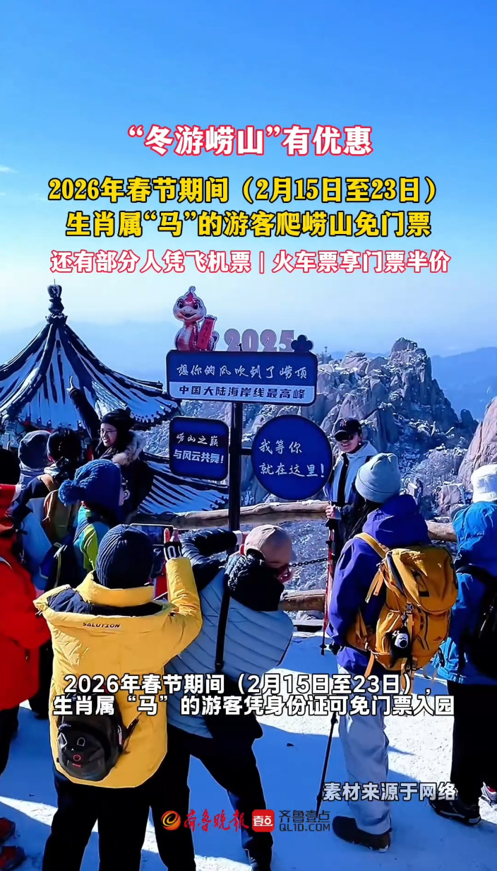 果然视频丨“冬游崂山”有特色也有优惠,这些人群免门票或半票齐鲁晚报·齐鲁壹点客户端 06:23原创近期,崂山风景区围绕“冬游崂山”主题推出了一系列特色景观、文化活动和优惠政策。其中,2025年12月2日至2026年2月28日期间,凭七日内抵达青岛的火车票或飞机票,可在崂山各售票窗口享受门票半价优惠;2026年春节期间(2月15日至23日),生肖属“马”的游客凭身份证可免门票入园。两项优惠均不含观光车、索道等项目,且不与景区其他优惠叠加使用。 (齐鲁晚报·齐鲁壹点 台雪超)